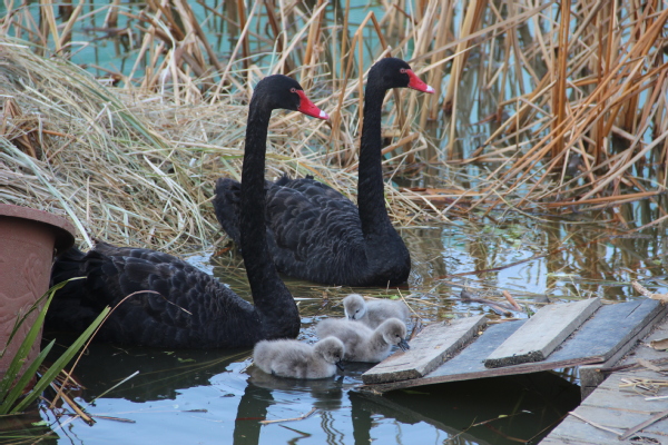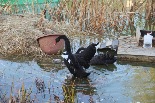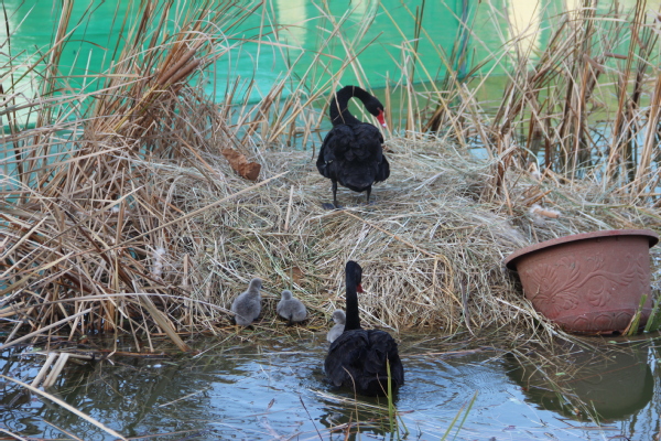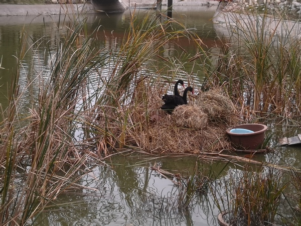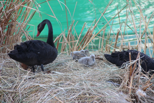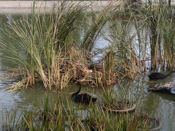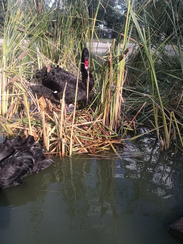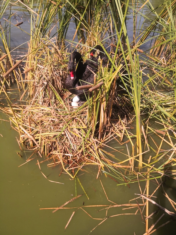 9月24日,黑天鹅产下第一枚天鹅蛋,随后的几天里,每1-2天都会产下一枚新蛋,产下5枚蛋后,黑天鹅夫妇就进入了正式的孵化阶段。雌雄天鹅轮流孵化,但主要以雌天鹅为主。当一只天鹅孵化时,另一只天鹅负责警戒工作,不让湖里的7只鸭子靠近巢穴,当有人员靠近时,黑天鹅也会拍打翅膀产生巨大的噪音,并脖子直立,鸟喙向下发起警告。