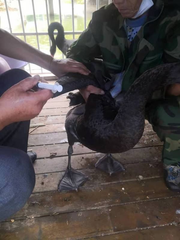 为了给天鹅增加营养,工作人员为天鹅增加了小鱼、蔬菜、贝壳粉等食物。每当工作人员为天鹅投放饲料时,负责警戒的天鹅都会像工作人员发出警告,并用翅膀拍打工作人员。