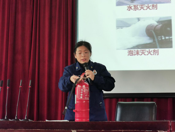 首先,高区消防大队宣传科刘干事做了消防安全知识的讲解。消防安全是一环扣一环,思想上防患未“燃”,胜过一切救助。刘干事从火灾的基本概念,灭火的基本方法,火灾的种类,灭火剂的分类及适用范围,公共场所火场疏散逃生等方面进行了详细的说明。同时,刘干事针对大学生服务区这类小型经营性场所做了专门的强调,小型经营场所里商铺和人员比较密集,分布着多种经营业态,可燃物也比较多,消防工作稍有疏忽就会造成防火安全隐患,小场所隐藏着大火情,大家必须警钟长鸣时刻警惕,杜绝消防安全事故的发生。