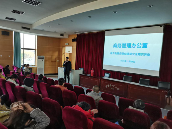 2020年11月24日下午,后勤保卫处商务管理办公室联同保卫办公室举办商户及联合服务单位消防安全知识讲座培训活动。大学生服务区、快递服务平台、洗理维修部等商户及服务单位50余人参加了本次讲座,应邀出席的还有后勤保卫处保卫办公室王丽波主任,培训活动由商务管理办公室主任邹志强主持。