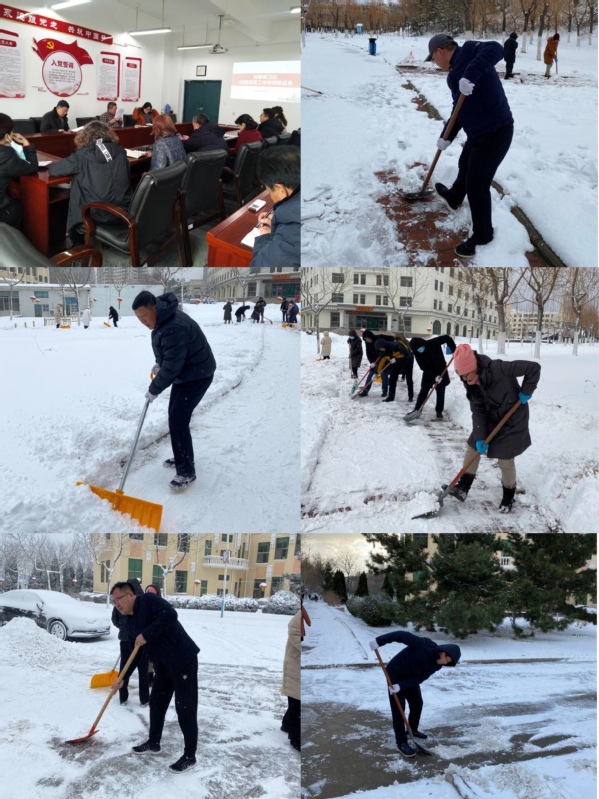 为了做好冬季校园清雪工作,保证校园道路通畅,确保师生员工出行安全,同时切实落实精细化管理,提升工作成效,后勤保卫处在校区党委副书记、副校长赵国亮带领下、处领导的指挥下,时刻关注天气情况变化,召开多次清雪方案专项会议,制订清雪工作方案并随时完善更新,明确清雪标准,加强甲方监督监察。针对大、中、小雪不同天气情况下,结合校园师生出行情况将校园清雪道路、区域设定不同等级,要求不同等级路段、区域在规定时间节点内按规定质量完成相应清雪工作。