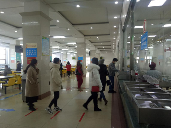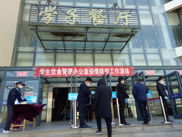 本次演练对学生进入餐厅、就餐、离开等各项环节进行了全流程模拟。对每位进入餐厅的人员进行身份检验,师生逐个接受测温,体温正常方可进入餐厅。为避免人群聚集,采取错峰就餐的方法,就餐过程中单人单桌,同向而坐,互不交流。学生在指定标志线前排队取餐,就餐后戴好口罩从指定通道离开餐厅。学生离开后,物业清扫员开展消杀工作、开窗通风,保持餐厅清洁卫生。