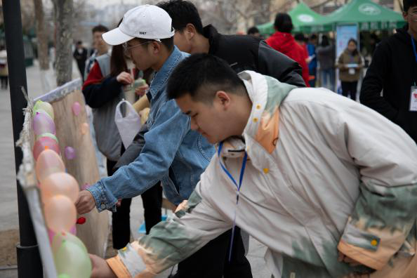 活动的第一个游戏便是趣味横生的飞行棋。游戏骰子转不停,同学们积极回答“性与生殖健康”的有关问题,游戏中也能获得对“性”的认识。接下来是飞镖扎气球的活动,连环的气球爆破声,瞬间点燃了同学们的热情。