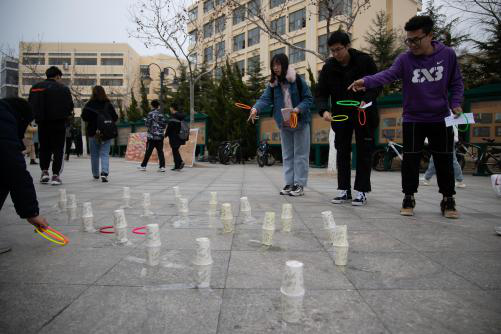圆环套纸杯的活动一下子带着大家重回童年,在场的同学都玩得不亦乐乎。