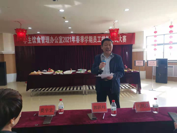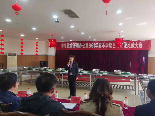 2021年4月14日下午,学生饮食管理办公室2021年技能比武大赛在学子餐厅四楼零点厅召开。工会常务副主席兼机关党委书记、离退休办公室主任莫宇宏,后勤保卫处处长林建秋,后勤保卫处党总支书记郭跃峰,后勤保卫处副处长迟春霞,副处长毛凤虎,副处长袁广龙,后勤保卫处综合管理办公室主任连丽,后勤保卫处综合管理办公室监察员裴新军,学生饮食管理办公室主任钱恺,副主任孙婷婷,副主任高飞出席了本次比赛。