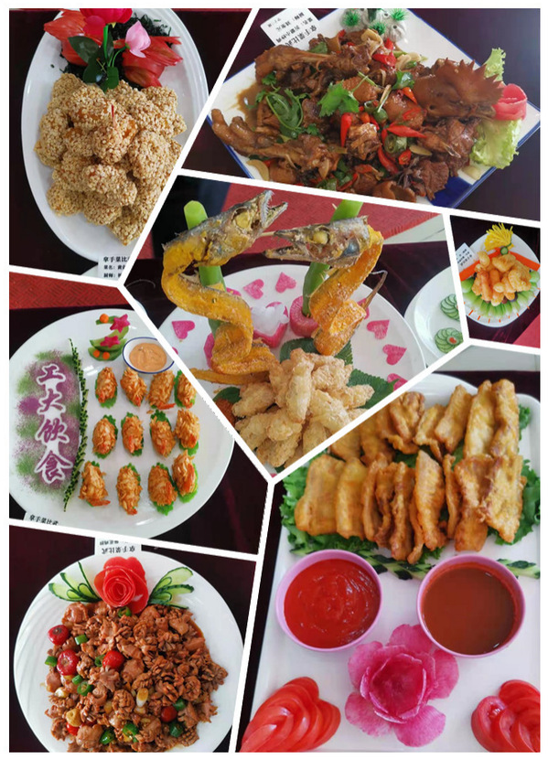 随后,大赛正式开始。首先进行的是红案技能比武,分为刀工菜炒土豆丝比赛和拿手菜比赛。师傅们各显身手,拿出看家本领,同样的土豆丝做出了不一样的味道;拿手菜比赛更是让人眼前一亮,各式雕花、造型齐上阵,炒的、炸的、炖的,各式菜品让评委们不住称赞。学子餐厅一楼刘红军巧用两条刀鱼炸出“飞龙在天”的造型,一上场就赚足了观众的眼球。