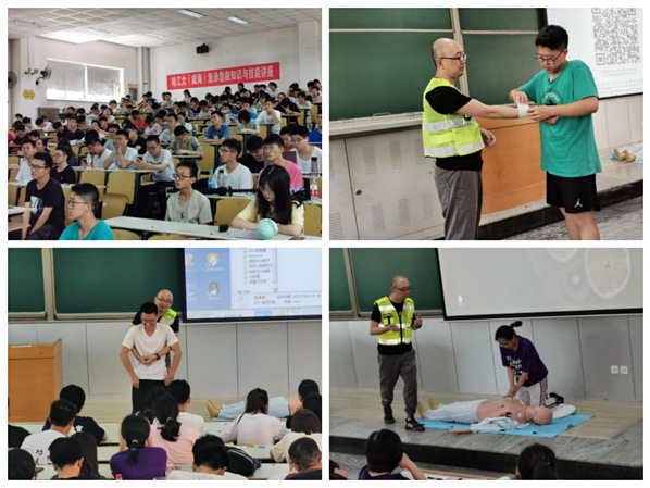 两场急诊急救培训,均采取了理论讲解、现场演示、实际操作等多种形式进行。医生们通过PPT演示详细讲解了外伤、烧烫伤、中暑、溺水、中毒等的诊断及处置方法。通过现场演示的方法详细讲解了外伤如何止血、包扎,气道梗阻时的海姆立克急救方法。重点讲解了心肺复苏术(CPR)的操作技能,包括发现病人时不要慌乱,采取“一唤、二看、三呼、四摆”的方法,判断病请,然后采取救护。详细讲解了心肺复苏时的手法及注意事项,并现场指导学生演练。